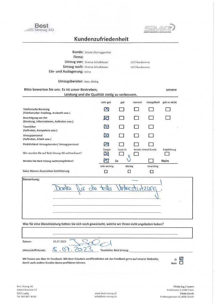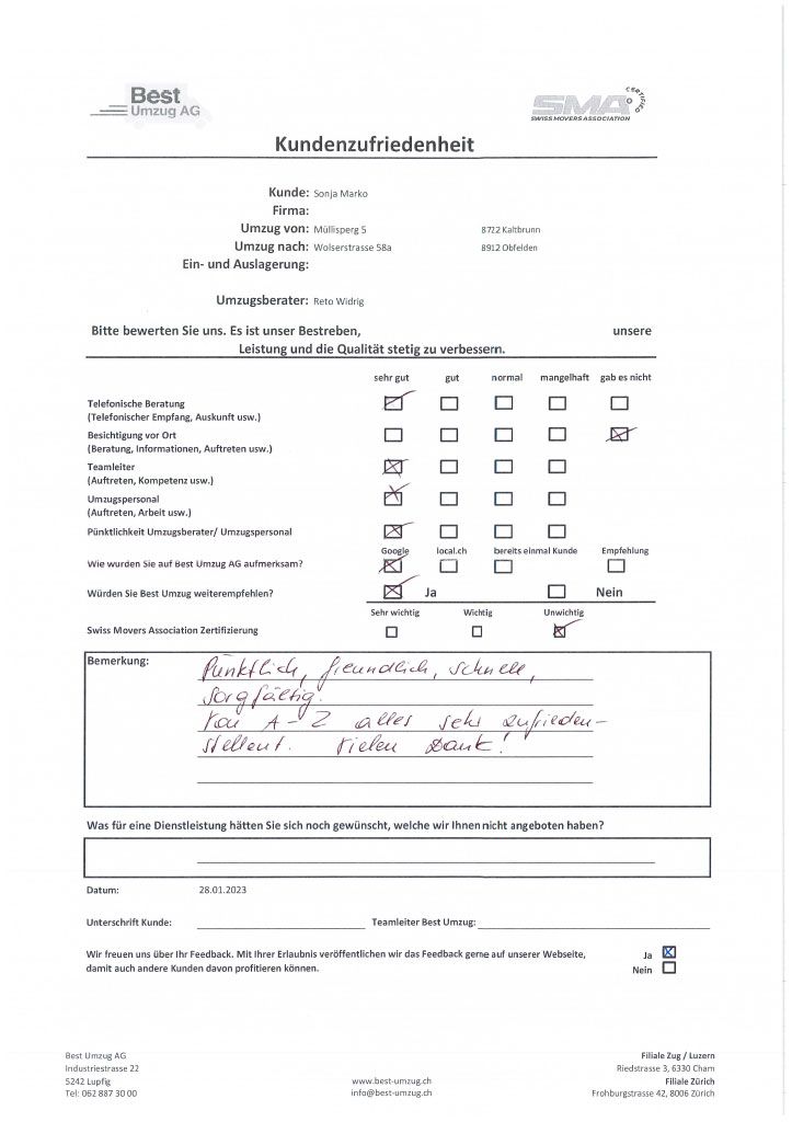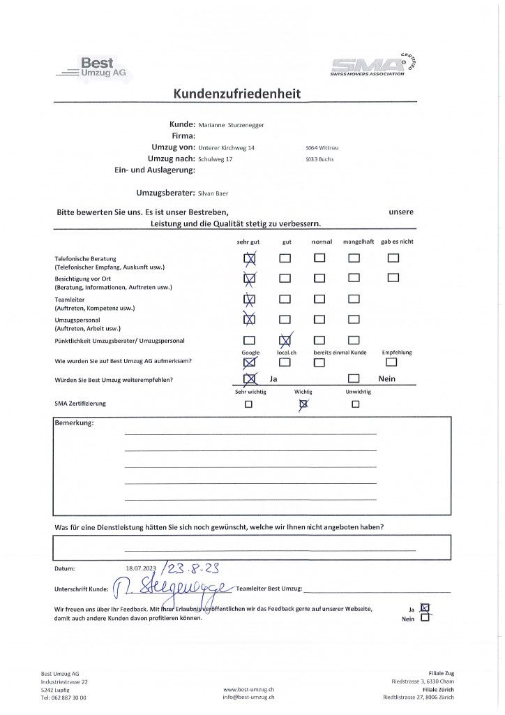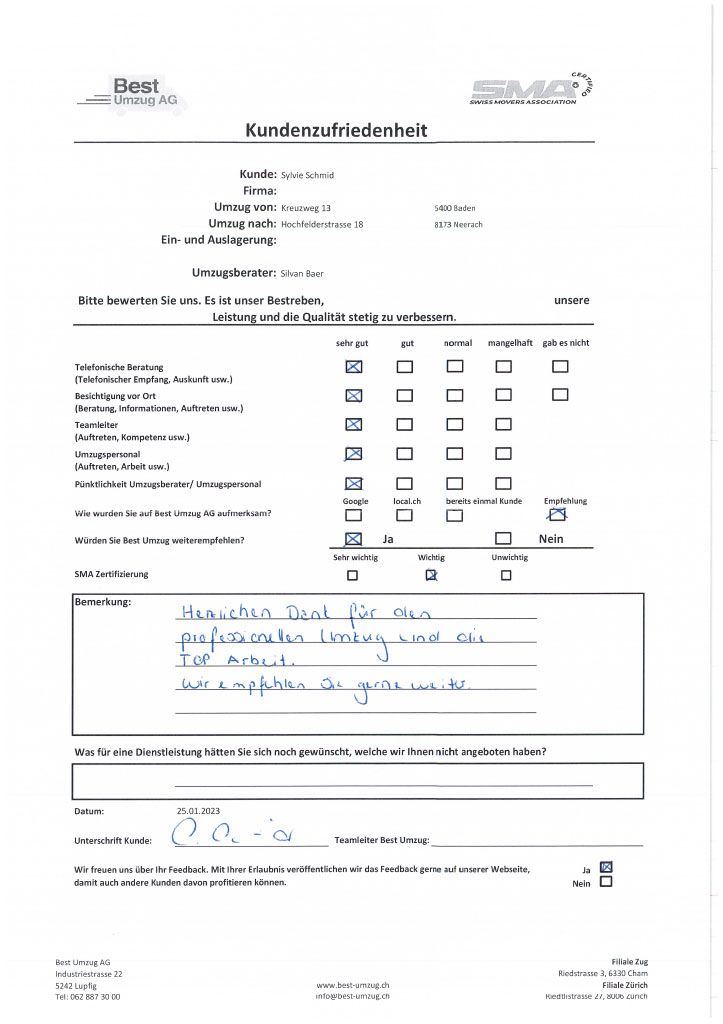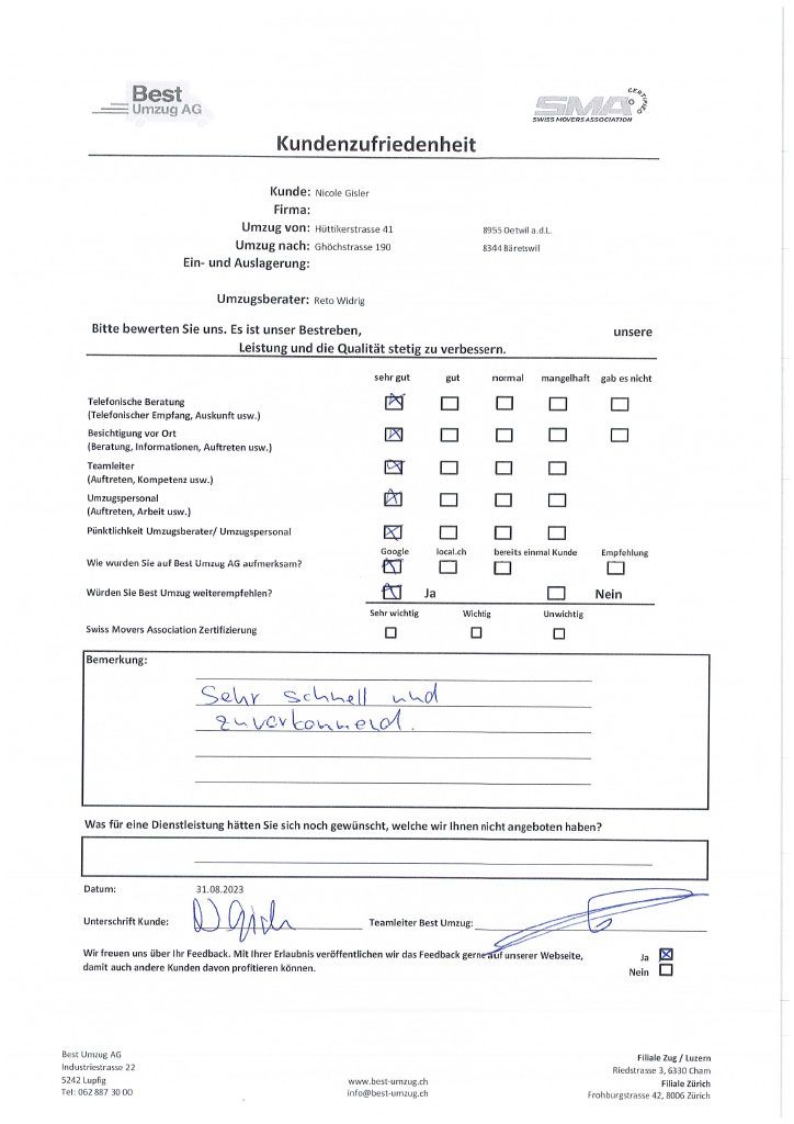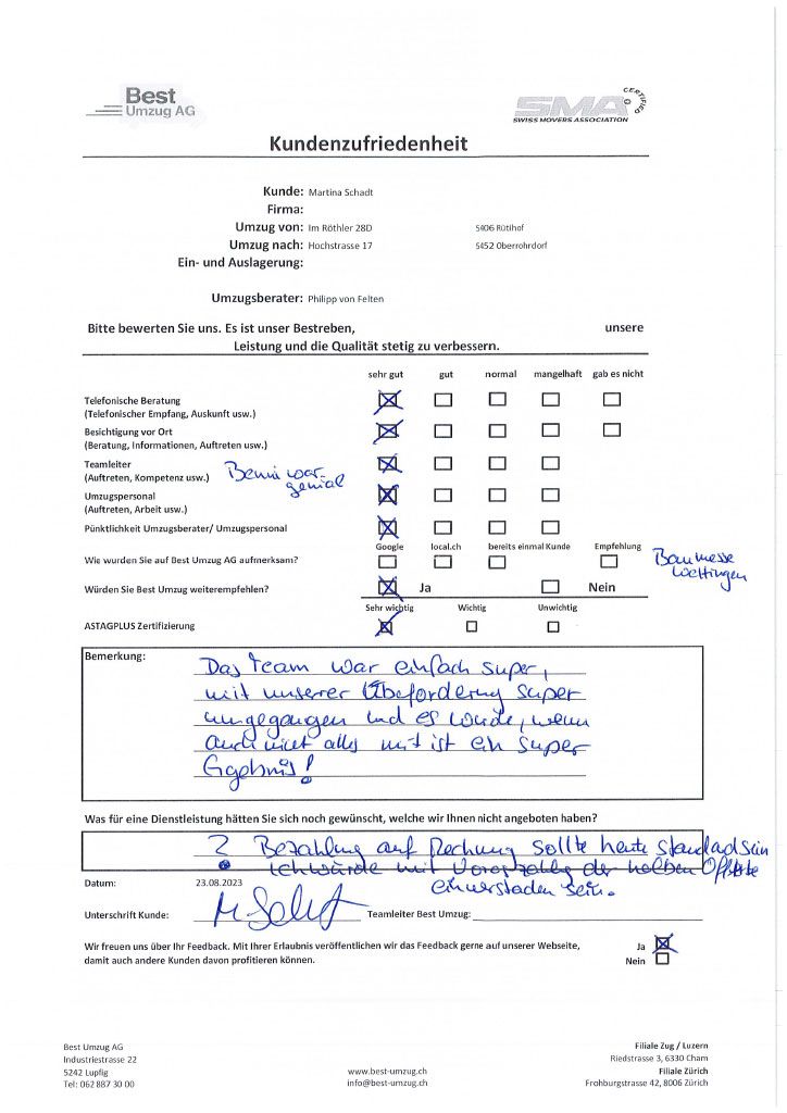 Die Zufriedenheit des Kunden mit unserem Umzugsservice steht stets an erster Stelle. Aus diesem Grund können Sie sich hier selbst ein Bild von der Bewertung des Umzugs seitens unserer Kunden machen. Um unsere Umzugsfirma kontinuierlich zu verbessern und auf Anregungen reagieren zu können, führen wir regelmässige Befragungen zur Kundenzufriedenheit durch. Nicht nur die Arbeit des Umzugspersonals, sondern auch die telefonische Beratung, die Besichtigung vor Ort, das Auftreten des Teamleiters und die Pünktlichkeit sind wir für uns wichtig.
